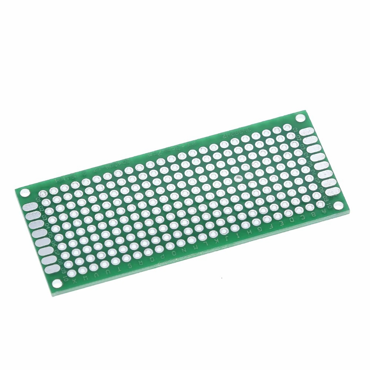 Protótipo Placa Universal Verde 3 X 7 perfurada de dupla face em fibra de vidro com as dimensões de 3cm x 7cm com colunas e linhas marcadas com letras e numeração para facilitar a identificação na hora da montagem de seu projeto.